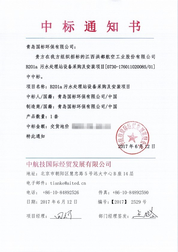 日前,青島國標環(huán)保有限公司成功中標江西洪都航空工業(yè)股份有限公司B201a污水處理站設(shè)備采購及安裝項目。